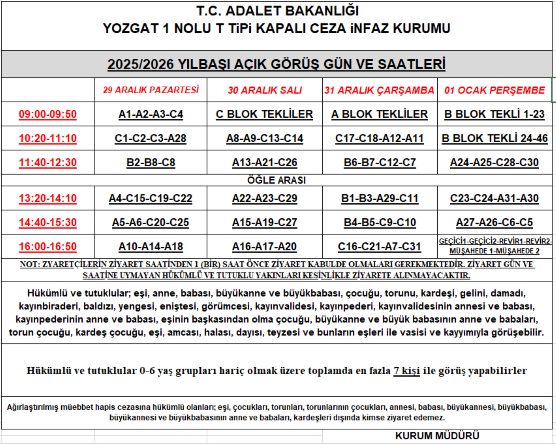 2025 Yılı Yozgat 1 Nolu T Tipi Kapalı Ceza İnfaz Kurumu 2025/2026 Yılbaşı Açık Görüş Günleri ve Saatleri Bir Daha Gösterme x