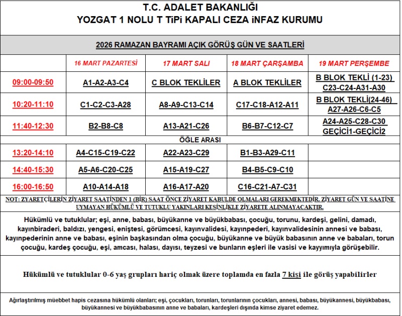 2026 Yılı Yozgat 1 Nolu T Tipi Kapalı Ceza İnfaz Kurumu Ramazan Bayramı Açık Görüş Günleri ve Saatleri